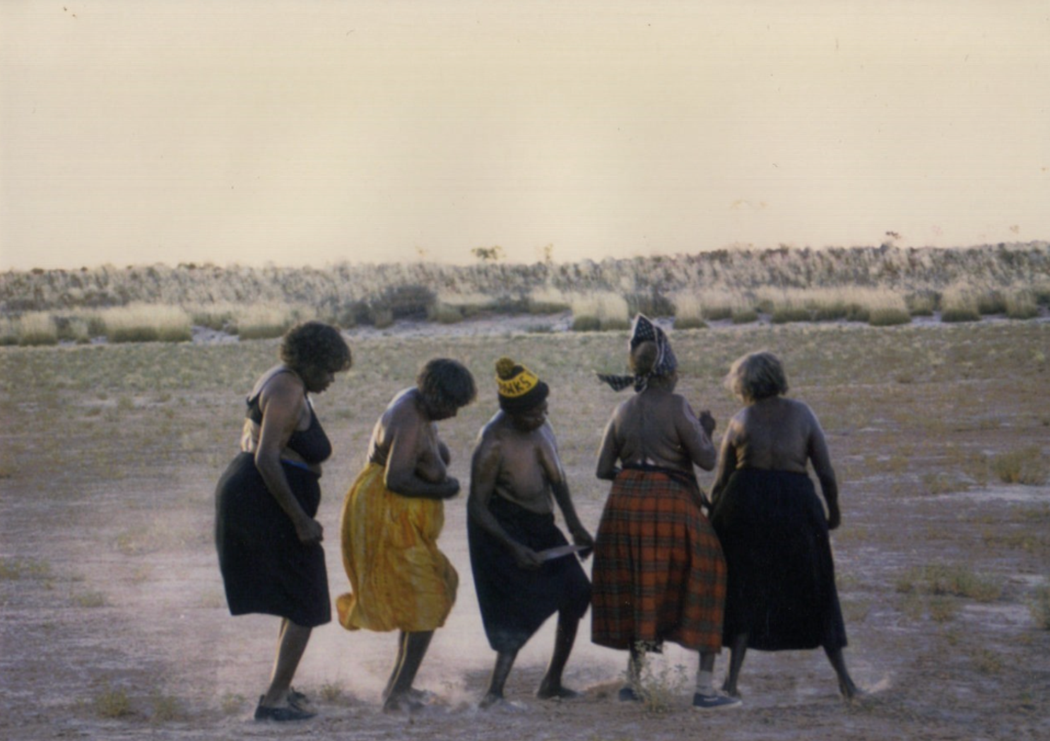 A. In the videos available of Walpiri women’s dances on YouTube, from festivals in Lajamanu and Yuendumu, one woman sings a tune at once monotonous and pleasantly melodic. The dancing women’s breasts, shoulders, and upper arms are painted with an off-white body paint of parallel lines surrounding circles at the shoulders, sternum, and nipples. The graphics of the body paint are part of the ceremony passed down between women. The dancers move in a stooped shuffle, digging sticks in hand, or in a low jump, feet barely leaving the sand. Stephen Page, director of the Bangarra Dance Theater, describes Aboriginal dancing as “foot to earth.”6