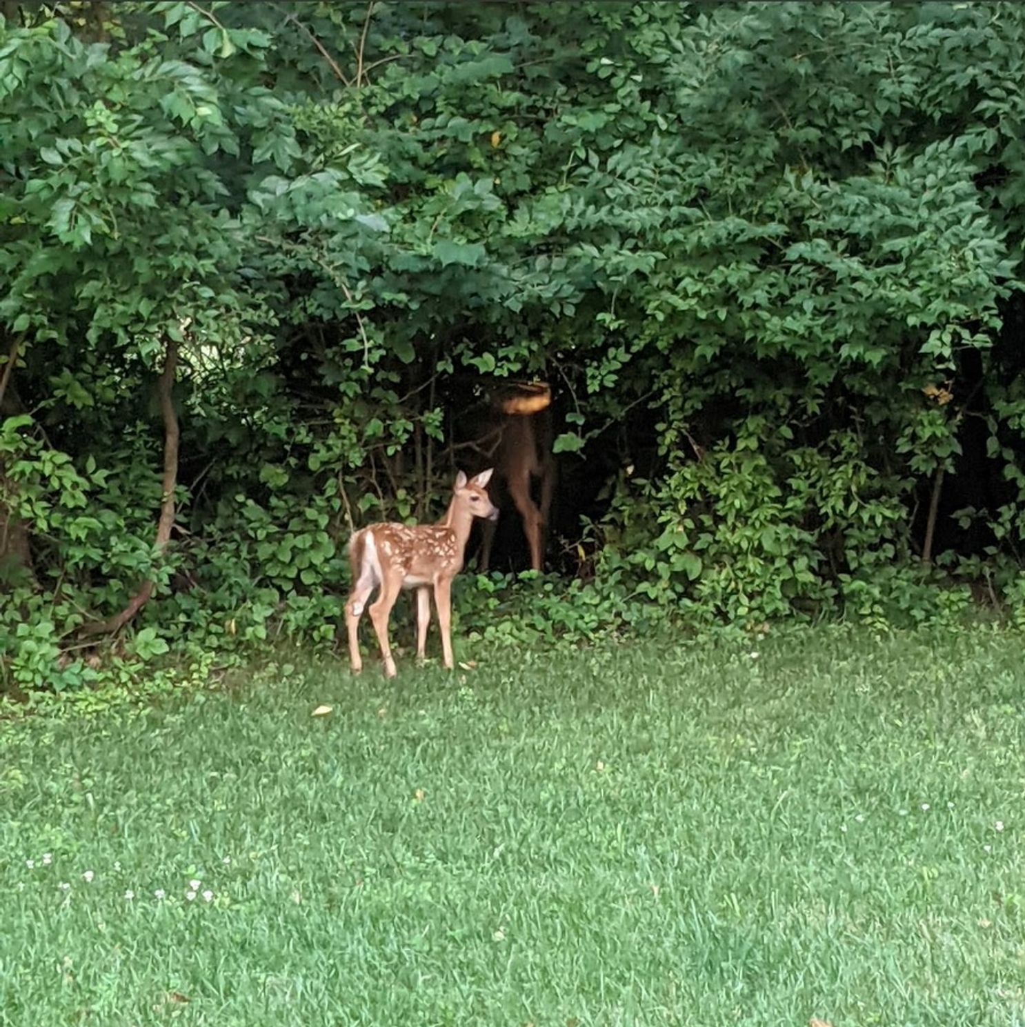 "One of the back yard fawns (with mama stepping off into the woods behind)."