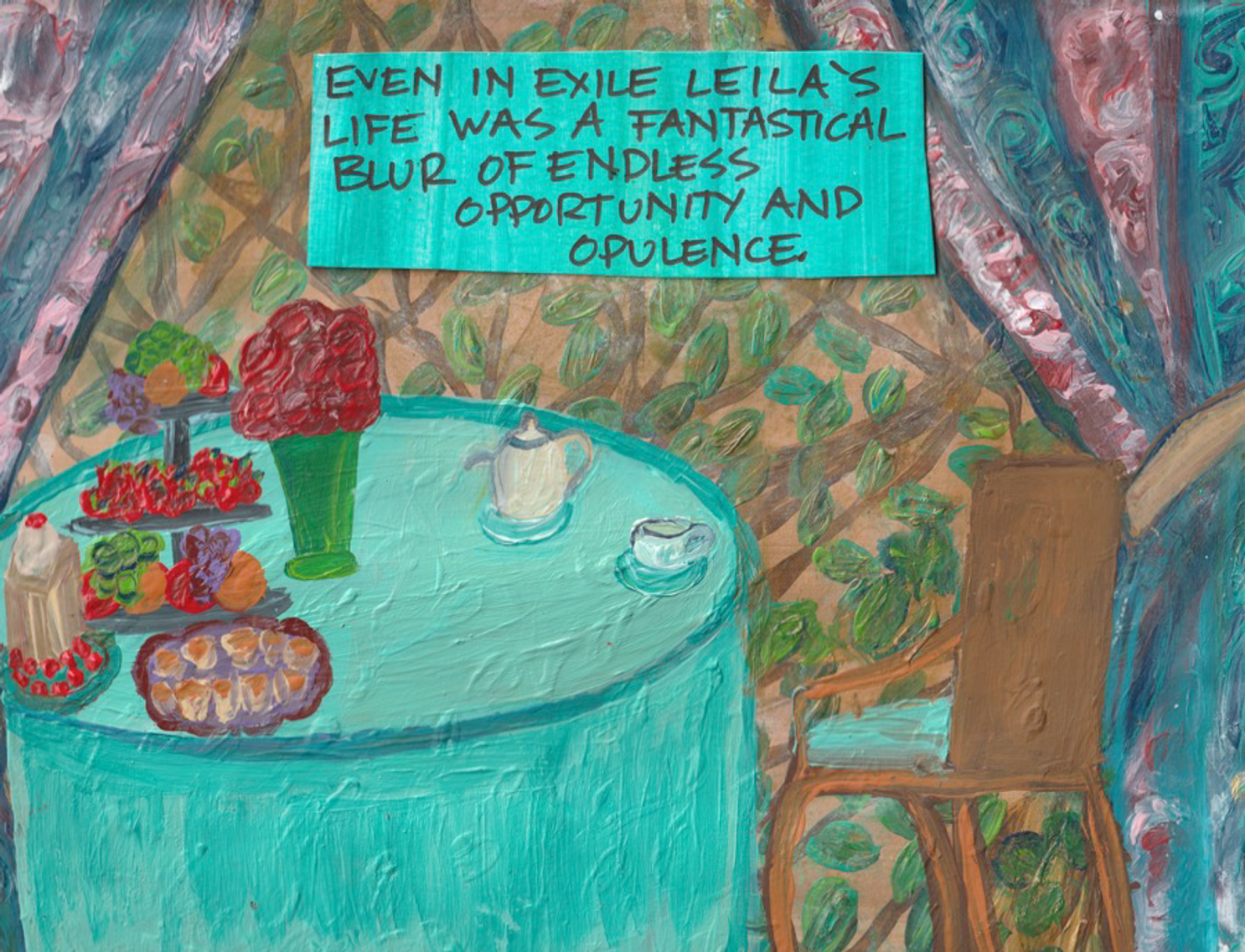From Tripoli to Tehran, so begins the imaginary friendship of Kowsar Khoshnoodi Kia, myself, Hana Gaddafi, and Leila Pahvlavi. Two living (three eyes total), one half alive, one dead.