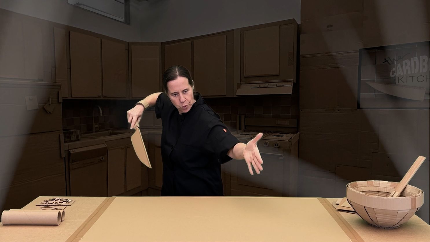 KM: I love experimenting with scale because this is where I can test how much the viewer is willing to suspend disbelief. It’s playful and mischievous. I play with scale constantly when I’m editing, though it only occasionally appears in the final work. For example, in “The Best Chef” video, I was originally editing with two of me in the kitchen, and the two were really small, in order for the kitchen to appear ridiculously large. But in the end, there is only one chef and in a normal-sized kitchen. The extra-large cardboard hand is the only object that is sized out of the ordinary. This mechanism lets me toggle between humor and absurdity, but it also allows me to assert agency. It lets me take up way more space than reality allows. It’s me playing with authority…poking at that in-between space where power and absurdity coexist. I always want to be bigger (taller, more heard) in real life.